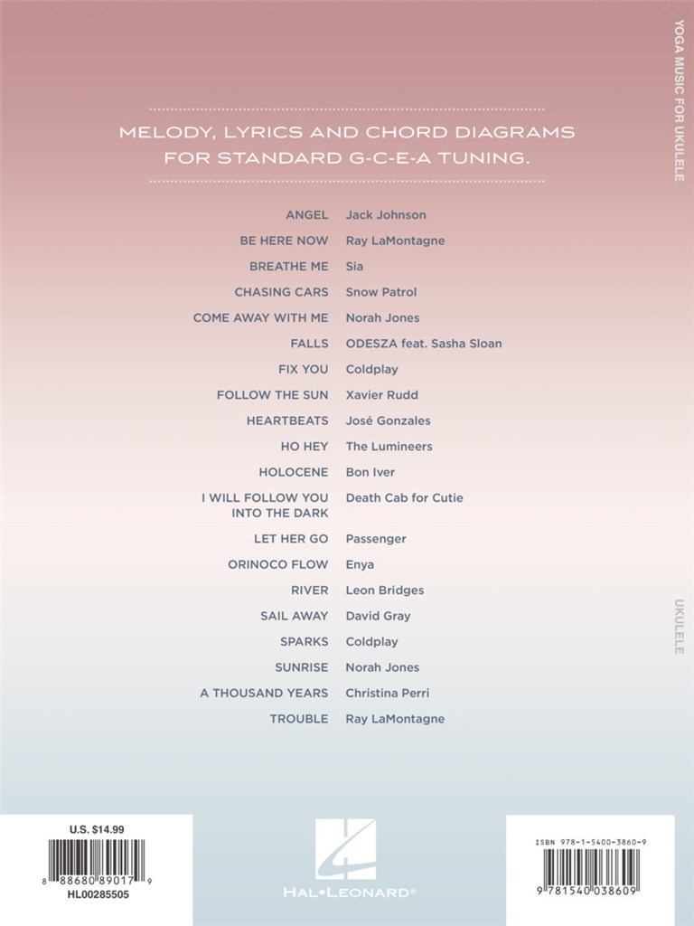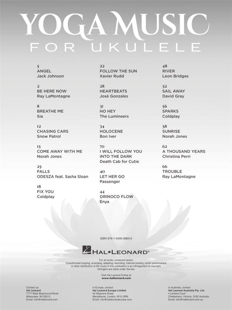 Music perfect to accompany yoga sessions are featured in this collection of melody, lyrics and chord diagrams for standard G-C-E-A tuning on the uke.