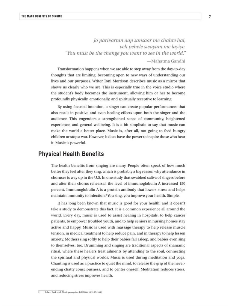 Entretiens avec Patty Austin, Ysaye Barnwell, et d'autres prêtent leurs points de vue au chant, la connexion corps-esprit, et une approche naturelle / bien-être porté à musicalité. Le CD d'accompagnement soutient les exercices pratiques et des approches à l'apprentissage de nouvelles chansons.